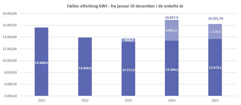 Fælles elforbrug i kWt fra januar til december i årene: 2021, 2022, 2023, 2024 og 2025.