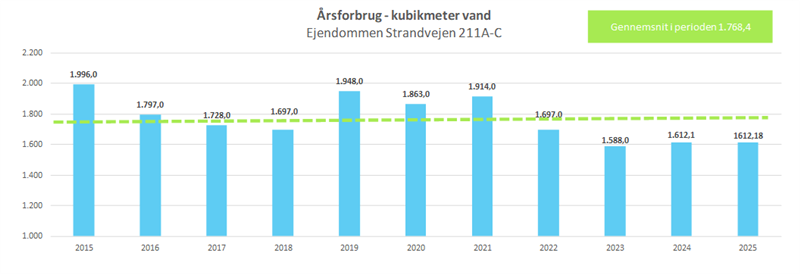 Bemærk at vandforbruget i ejendommen er lavere end det årlige gennemsnitlige vandforbrug i perioden fra 2015 til 2025 (1.768,4 kubikmeter).